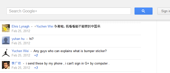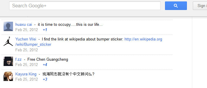 27 Feb 2012| Chinese internet users [began flooding](http://www.ctv.ca/CTVNews/SciTech/20120226/chinese-flood-obama-site-after-googleplus-clock-lifted-120226/ “Chinese flood Obama site after Google Plus block lifted | Sci-Tech”) Barack Obama’s Google+ page with comments following an unblocking by their government. Most of the comments were in Chinese were political in nature, while others were just people ranting. This specific comment made me laugh (all the comments were being posted in Obama’s latest update, which was regarding bumper stickers): |