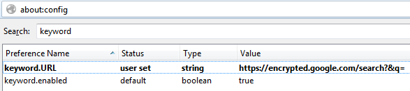 I remember I had specifically set the keyword.URL preference in about:config to use Google’s encrypted search and not pass any extra parameters (browser being used, language encoding, etc). I checked my about:config settings and sure enough, it was still there. I figured it might a bug so I searched around and discovered Mozilla thought it was a good idea to disable that feature starting with Firefox 23 in order to stop “search hijacking”. This has in turn disabled Google’s Browse By Name (I don’t personally use this, but loads of people do) and any third party search providers a user may have added without using the Manage Search Engines option.